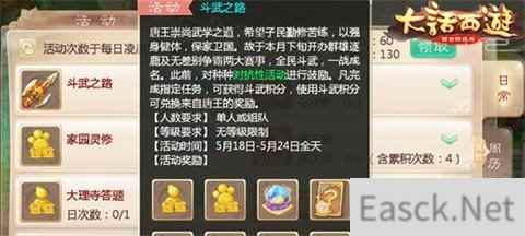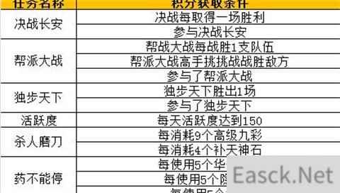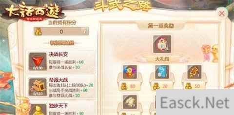 5月18日10点至5月25日5点活动期间,体验“决战长安”、“帮派大战”、“独步天下”等活动专属对抗性活动任务,即可赢得丰厚斗武积分。累积积分,还可在唐王处兑换盘古精铁、龙之骨、见闻录、神兽属性卡等在内的丰厚游戏道具!(奖励分为5个层次,价值层层递进。兑换本层所有奖励后,可领 取当层神秘大礼包并开启下一层兑换。)