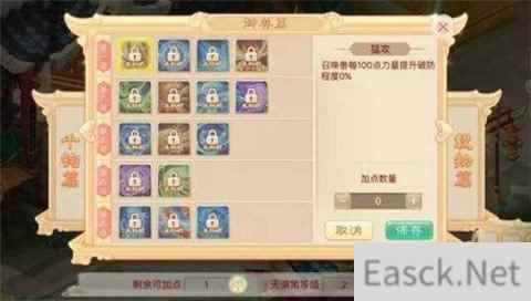 天演策的加点规则:天演策共三篇,分为千钧篇(强法),载物篇(强抗),御兽篇(强宝宝)。每篇有5层,第一层可以直接加点,第二层需要10点加点才能开启,第三层需要20点,第四,五层需要30点才能开启,每层有四到五个技能,每个技能上限可以加5点,0转可加25点,一转可加50点,二转可加70点,三转可加100点。 千钧篇 第一层怒涛增加仙法,鬼火,三尸狂暴率X%,狂魔增加忽视抗震摄X%,破军增加破防概率X%,破防程度X%,凝神加强冰混睡忘X%,诛神对召唤兽忽视仙法,鬼火,三尸,毒,震慑增加自身的X%,忽视冰混睡忘增加X%。