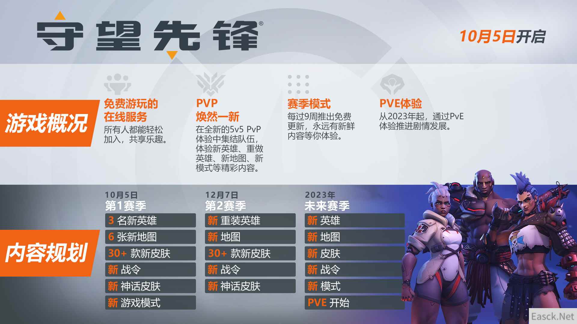免费游玩的在线服务体验 对我们的游戏和玩家而言,《守望先锋》“归来”转为免费游玩模式是自然而然的一步。从诞生起,《守望先锋》始终是一款社交游戏,当我们聚首同乐,社区才能享受到最大的乐趣。免费游玩模式能够消除门槛,使所有玩家都能加入游戏、和好友组队,在网络上找到一起玩的同伴。在转变为免费游玩模式的同时,一起游玩、提升、使用解锁的内容。 取消补给箱 周期发布新内容 《守望先锋》“归来”将取消原有的补给系统。经过革新的在线服务将使玩家有能力塑造自己的体验。玩家可以通过战令,以及全新推出、稳定更新的游戏内商城,直接获取自己想要的物品。我们的团队将持续制作赛季内容,每过九周发布赛季内容,确保所有玩家都能找到新鲜有趣、值得期待的内容。 规划和赛季 隔赛季新增英雄 在下方的规划图中,你可以找到第一赛季和第二赛季的短期计划,以及游戏在2023年和未来的长期发展计划。玩家预计每隔一个赛季都能收获一位新英雄,间隔赛季则会推出新地图、新模式等游戏元素。