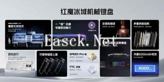 还有极具科技美感的红魔冰域键盘,自带透明视窗并配备一颗多功能旋钮,有线回报率达到8K,无线回报率达到4K,暗夜骑士和氘锋透明两款配色分别首发SPEED Pro轴和TTC冰轴。