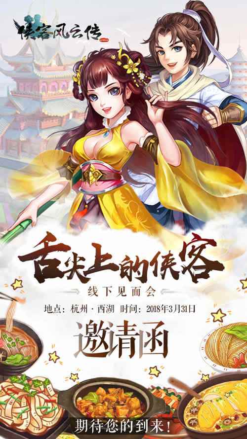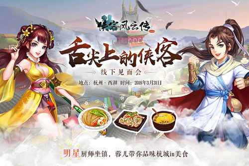 就在本周六3月31号,趁着春光明媚、天气大好,“舌尖上的侠客”第一站:杭州线下见面会将在西湖边举行。我们已经邀请到一位知名杭帮菜大师,将在现场为大家烧制上文提到的杭州名菜:西湖醋鱼、龙井虾仁、杭州卤鸭。品杭城美味,赏杭城美景,真正体验一把游戏里侠客的感觉。 那除了吃,当然是不够的。我们还会给报名活动的各位少侠准备一系列活动和惊喜,一起来看看吧。 1. 参与游戏 广交侠友 如何与其他陌生的侠友快速成为相见恨晚的至交?当然是一场有合作、有竞争的游戏比赛啦!更何况还是有奖的呢?我们为各位少侠准备了若干小游戏,如果你精通侠客或者金庸,肯定是有获胜加成的哦! 2. 现场抽奖 领取豪礼 一场好活动,是不可能没有抽奖环节的,你可能在年会上完美错过了所有的大奖,但是没关系,我们准备的奖品够多!中奖率够高!除了各种周边以外,还有《侠客风云传前传》豪华版套装哦。 3. 共享晚餐 合影留念 说好的美食肯定少不了,除了上面明星厨师为大家展示制作的三道杭州名菜,大家也可以尽情猜猜我们这次给大家准备的菜单。你猜得到,算我输。饭后我们会进行合影留念,上一次单机版线下见面会之后,我们发现大家似乎很喜欢合影照片呢,我们这次也会准备照片现场打印送给大家。 4. 相互交流 畅所欲言 这次我们的运营团队也会来到现场,与各位少侠面对面交流。欢迎大家对游戏提出吐槽或者建议,工作人员统统都会记录下来。大家的想法与感受,是我们游戏不断改进的动力。请大家畅所欲言,不要拘束。 5. 阳光普照奖 领取福袋 最后的最后,才是重点!你以为我们只准备了抽奖?才不是呢,凡是来前来参与我们本次“舌尖上的侠客”杭州线下见面会的玩家,每人都可以现场领取一个限定纪念福袋,里面有姬无双小姐姐的手办和其他多种纪念品。
