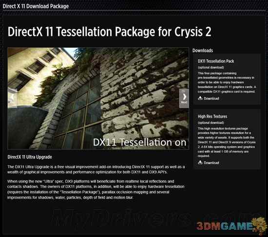令不少玩家望眼欲穿的《孤岛危机2》DX11升级包近日被意外放出,但是EA随即又屏蔽了相关资源的下载,并做出了简短的声明。 EA在官方社区网站mycrisis.com上解释说,《孤岛危机2》的DX11升级包、高分辨率纹理升级包都需要1.9版更新补丁这一前提,也就是说游戏必须先更新1.9版补丁,才能安装这两个资源包,但是1.9版补丁还没有发布,所以就算你拿到了这两个补丁包,也只能先等着。 EA表示,1.9版更新补丁、DX11和高分辨率纹理升级包都将在6月27日正式发布,有需要的玩家可以通过mycrisis.com网站免费下载 具体地址为:http://www.mycrysis.com/dx11
