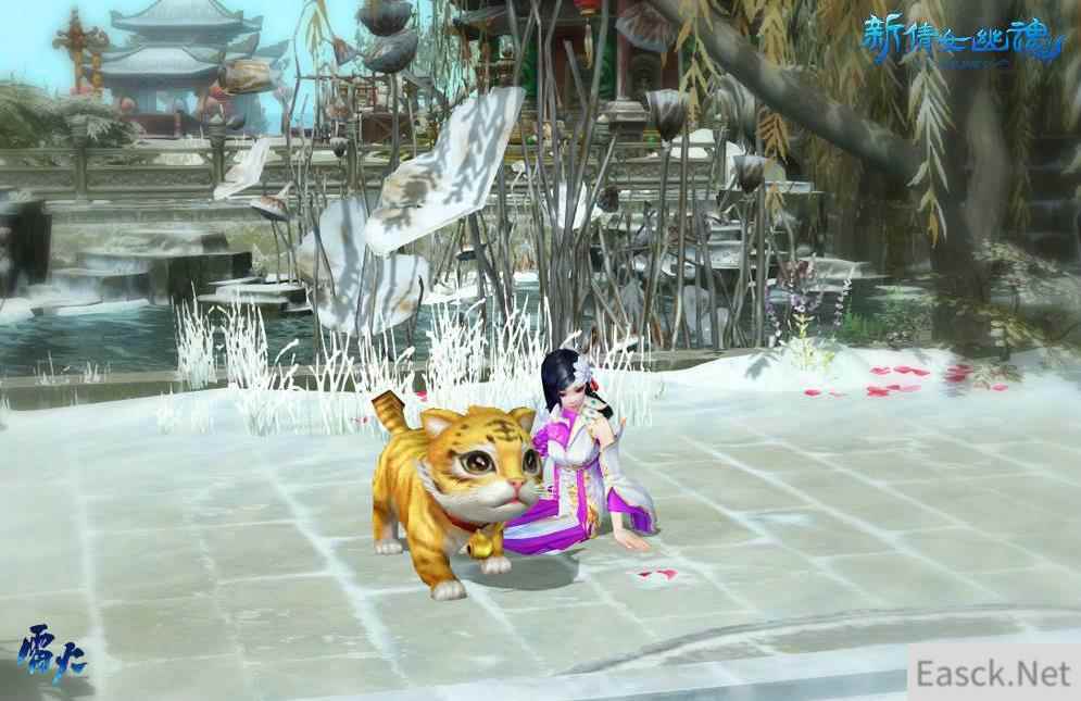 图3:软萌坐骑“胖福狸” 三、激萌灵兽——小虎咪 “小虎咪”虽为老虎,但形似猫咪,亲人活泼,激萌可爱。新手玩家满35级时可从新手礼包中获得可爱灵兽小虎咪,实为升级打怪的好帮手。