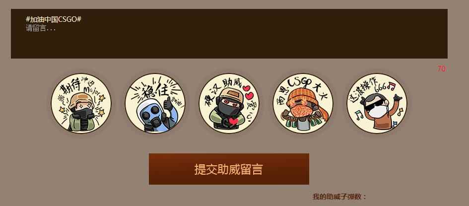 虽然我们距赛场万里之遥,但我们的支持和鼓励仍然会成为赛手们冲破难关的动力。除了将代表FG的蓝色剑齿虎印在武器上来宣告热爱,你还可以在助威专题页上写下你想对他们说的话,同时还有机会获得多重豪礼! 1、助威留言,解锁龙狙大奖 留言时间:2018年1月9日14:00-2018年1月15日24:00 在专题页上留下你想对FG战队和中国CS:GO说的话,当留言超过10000条时,CS:GO国服将通过微博向粉丝们送出龙狙大奖,微博关注CS:GO并转发抽奖活动微博即可参与。 而在比赛中,FG战队每击败一支队伍,将使龙狙大奖数量翻倍!若FG战胜了3名对手,那么活动送出的龙狙数将为8把(1*2*2*2)。因此大奖需要粉丝和选手们的共同努力。