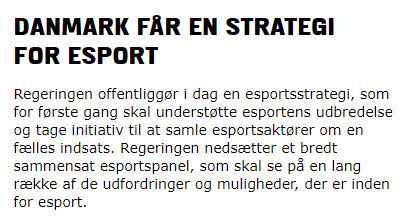之前有媒体曾报道丹麦国防部队有意招募游戏玩家入伍,因为他们反应快、抗压强团队意识好。而最近丹麦政府表示将大力支持电子竞技发展,确认将电子竞技作为国家战略之一。这是首次对电子竞技传播的官方支持,并且会主动召集电竞选手共同努力,政府表示正在设立一个特别的电竞组织,将负责注意电竞的未来和机遇。