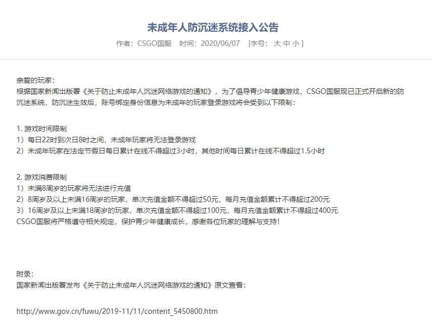 亲爱的玩家: 根据国家新闻出版署《关于防止未成年人沉迷网络游戏的通知》,为了倡导青少年健康游戏,CSGO国服现已正式开启新的防沉迷系统,防沉迷生效后,账号绑定身份信息为未成年的玩家登录游戏将会受到以下限制: 1. 游戏时间限制 1)每日22时到次日8时之间,未成年玩家将无法登录游戏 2)未成年玩家在法定节假日每日累计在线不得超过3小时,其他时间每日累计在线不得超过1.5小时 2. 游戏消费限制 1)未满8周岁的玩家将无法进行充值 2)8周岁及以上未满16周岁的玩家,单次充值金额不得超过50元,每月充值金额累计不得超过200元 3)16周岁及以上未满18周岁的玩家,单次充值金额不得超过100元,每月充值金额累计不得超过400元 CSGO国服将严格遵守相关规定,保护青少年健康成长,感谢各位玩家的理解与支持!