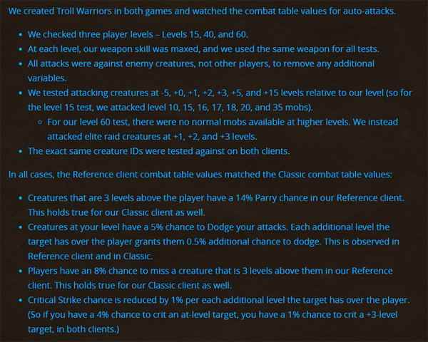 角色等级:15,40,60; 武器技能为该等级下的满技能,并使用相同的武器; 测试对象等级:-5,0,+1,+2,+3,+5和+15(即对15级角色来说,测试对象等级为10,15,16,17,18,20和35)。对60级角色来说,由于没有更高等级的怪物,因此调整为+1,+2和+3等级的团本精英怪; 在两个服务器中,使用相同的怪物进行测试。 经过测试,两个服务器上角色的战斗数据相吻合: 比玩家角色高3级的怪物拥有14%的招架几率 与玩家角色同级的怪物有5%的几率躲闪攻击。怪物每比玩家高一级,额外增加0.5%的躲闪几率 玩家角色在攻击比自己高3级的怪物时,有8%的未命中几率 目标每比玩家高一级,被暴击几率降低1%(例如你对一个同级的目标有4%的暴击几率,那么对一个比你高3级的目标只有1%的暴击几率) |
