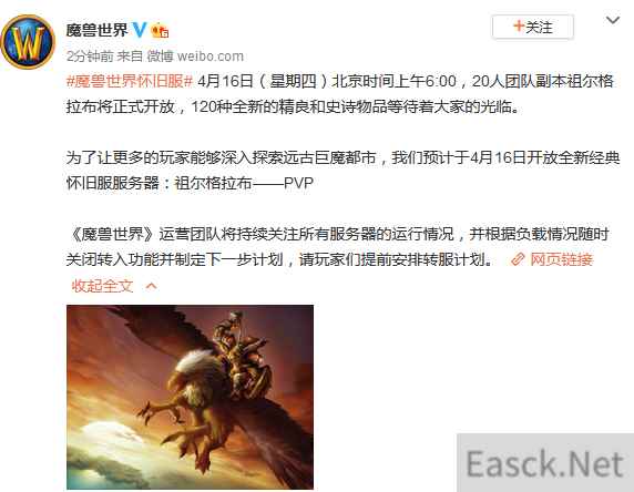 官方原文: 《魔兽世界》经典怀旧服将于4月16日(星期四)北京时间上午6:00正式开放20人团队副本祖尔格拉布,120种全新的精良和史诗物品等待着大家的光临。 为了让更多的玩家能够深入探索远古巨魔都市,我们预计于4月16日开放全新经典怀旧服服务器:祖尔格拉布——PVP 《魔兽世界》运营团队将持续关注所有服务器的运行情况,并根据负载情况随时关闭转入功能并制定下一步计划,请玩家们提前安排转服计划