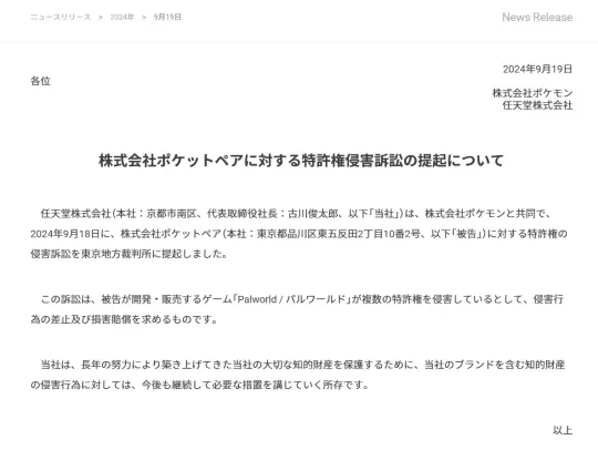 以下是翻译内容: 关于对 Pocket Pair 股份有限公司提出侵犯专利权的诉讼 任天堂株式会社 (本社:京都市南区,代表理事社长:古川俊太郎,以下简称“本公司”) 将与口袋妖怪株式会社共同于 2024 年 9 月 18 日,推出口袋对株式会社 (本社:东京都品川区东五反田 2 丁目 10 号 2 号,以下简称“被告”) 的专利权侵害诉讼已向东京地方法院提起。 该诉讼认为被告开发并销售的游戏“Palworld / Palworld”侵犯了多项专利权,要求停止侵害行为并赔偿损失。 本公司为了保护通过多年的努力建立起来的本公司宝贵的知识产权,对于侵犯包括本公司品牌在内的知识产权的行为,今后将继续采取必要的措施。 以上 |