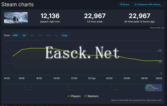 根据 SteamDB 的数据,《战神:诸神黄昏》Steam 同时在线玩家峰值为 22,967 。相比之下,《战神》(2018)在 2022 年 1 月 16 日(发售第三天)的同时在线玩家峰值达到了 73,529 。