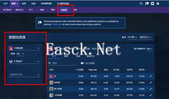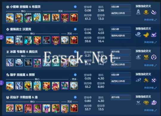 然后我要教一些深度的东西,就是大数据网站究竟该怎么用? 首先是大数据网站的阵容,大数据网站的阵容就是一坨!你要是按照这个,该怎么死怎么死,反正不论和低分段对局还是王者对局来说,肯定是不能用的。 他只能提供一些建议,就是能玩的阵容肯定在这里,但是什么真正是能用的,必须要自己重新评估,就好像六枪至今没有上大数据,因为这种9人口的应用阵容大数据根本不会解读。