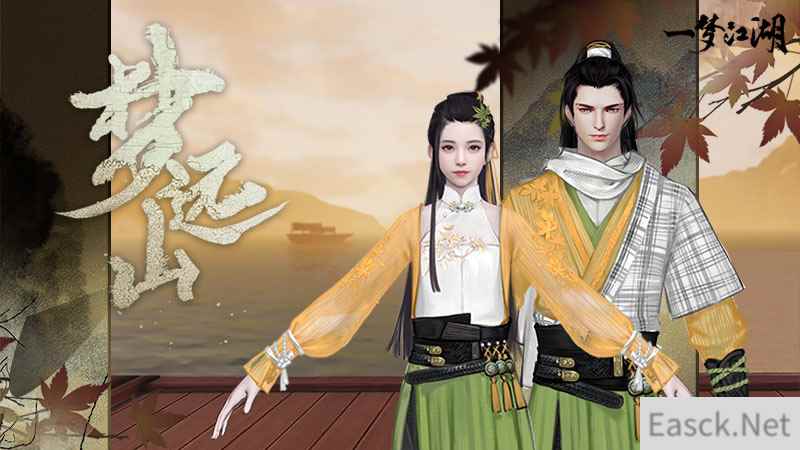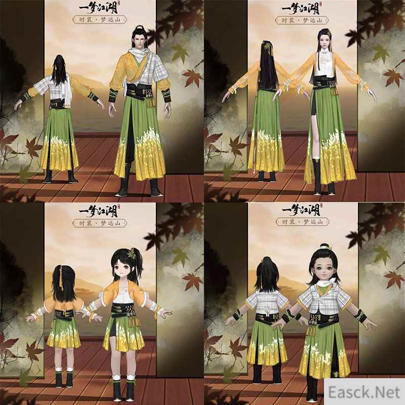 【专属时装“梦远山” 累计登录免费领取】 金秋飒爽,清凉利落。累签专属外观“梦远山”以金桂色和绿色为主,采用束袖束腰的设计,金叶与枫叶绣于衣料之上。清爽利落的风格驱走炎夏的最后一丝燥热,带来秋天干爽的气息。 成男、少年束起长发,搭配纯白围脖、细格纹半袖,时尚低调,利落洒脱;成女、少女外罩轻纱,枫叶作为发饰,裙摆轻盈,俏皮灵动,给这个秋天添一抹飒爽。