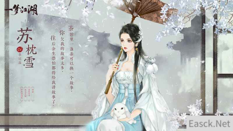 苏枕雪 【灵犀一点 首发人气NPC】 《一梦江湖》灵犀系统解锁的NPC分别是方思明、如尘大师、苏枕雪和陆轻眉。万圣阁少阁主方思明表面冷漠无情,但相识后对玩家诸多维护;如尘大师秉持独特信念,脱离佛门束缚后探究世界与人类极限才能;迷样女子苏枕雪温柔专情,武功深不可测;天机楼桂宫陆轻眉博学多识,永远一袭大红衣裳。他们带着各自的故事,期待与少侠展开一场江湖相遇。