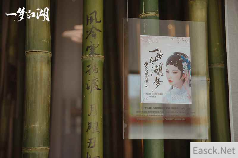 竹林中分散悬挂的透明展板,刻写着《一梦江湖》在多个传统和国风文化领域中做过的合作,如敦煌文化、汉服、昆曲等十几项非物质文化遗产。《一梦江湖》长期致力于致敬和学习传统文化,希望穿行其中的朋友们,也可以从这些图文中感受到传统文化与年轻游戏的碰撞融合。