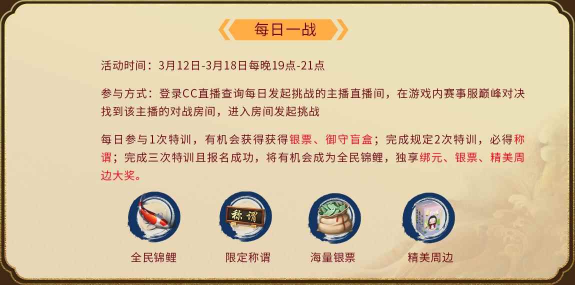 仗剑走江湖,赛前特训每日一战 3月12日至18日每日19-21点,一梦江湖知名KOL“正在火化”与知名CC主播将做客赛事直播间,现场进行账号调整的攻略讲解、赛事服的演示与切磋,帮助各位少侠们提前积累经验。每天都可通过直播间“每日一战”活动向KOL发起挑战,在实战中进步,少侠只要参与每日一战特训,就有机会获得银票、盲盒、商城周边等挑战奖励。每天参与都有机会获得,少侠可不要错过了!参与两次特训的少侠将获得专属称谓。在最后一天(3月18日),一梦江湖心易经理将携手CC主播带上同样丰厚的奖励,向广大少侠发起挑战。之后将会从参与三次特训并且最终报名的少侠中,挑选一位成为全民锦鲤,独享绑元、银票、商城精美周边大奖。