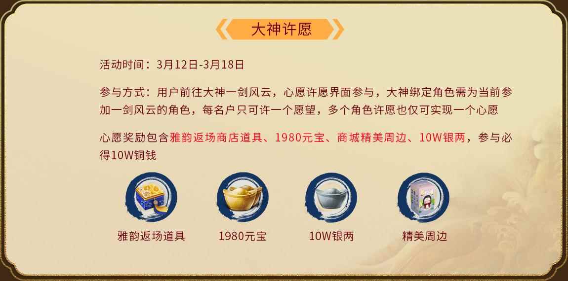 伴随着赛事的开启,更多精彩福利活动也将接连开启。3月12日至19日,前往大神一剑风云赛事专区进行许愿,完成挑战赢取心愿福利,雅韵返场道具、元宝、银两、精美周边都有机会统统带回家;