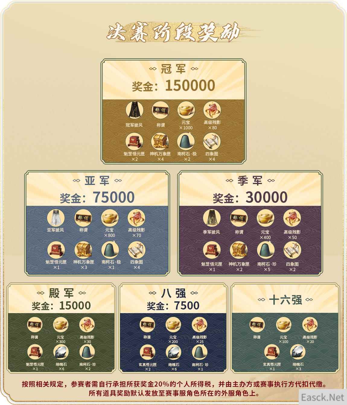 同时,在比赛的每一个阶段都有着丰富的游戏内道具奖励,只要参与人人有奖,胜利越多,元宝、高级残影、南柯石、银两、四象图、神机万象匣等丰富奖励静待少侠获取!若能脱颖而出来到决赛阶段,除众多珍贵道具外,还能瓜分总额高达30万的现金大奖,与专属绝版披风与称谓!