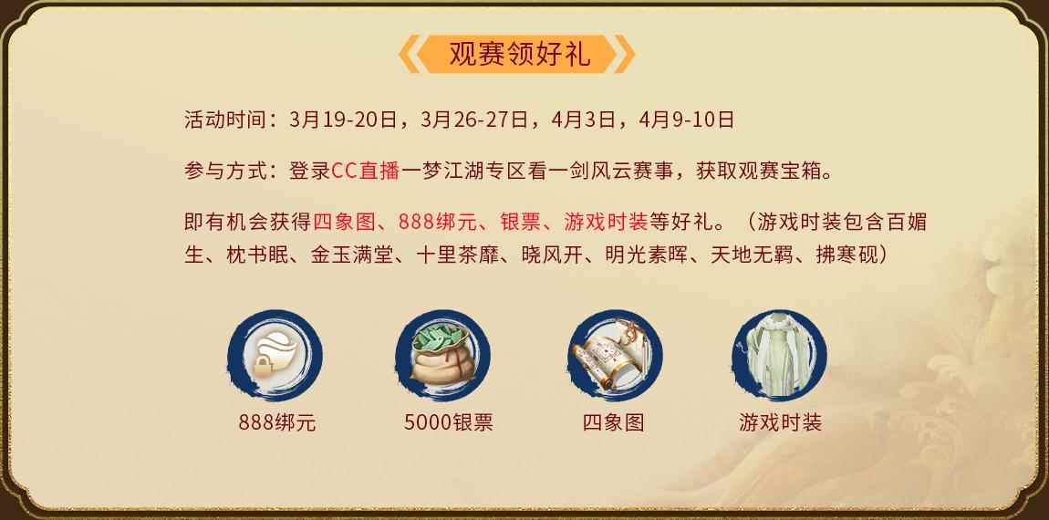 另外在CC直播观看赛事,参与开启宝箱抽取游戏礼包,绑元、游戏时装等丰富奖品!