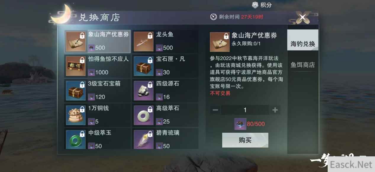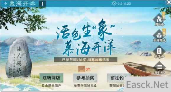 【慕海开洋趣味玩法来袭,钓“真”鱼兑象山海产优惠券】 9月2日至9月22日期间,少侠可通过中秋节活动页面进入“慕海开洋”玩法界面,点击“前往钓鱼”来到游戏内的象山场景进行海钓。