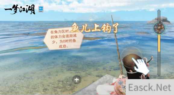 到达可垂钓区域时会有“海钓”按钮出现,点击便会自动抛竿进入慕海开洋玩法,“海钓”过程限时2分钟,少侠可通过观察竖状条、点击屏幕和消耗进度条的方式,得知鱼儿的动向,控制它们的体力值,把它们抓上岸!
