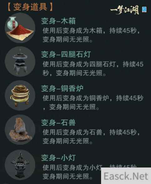 而变身道具也有五种,分别可变身为木箱、四腿石灯、铜香炉、石兽和小灯,且变身效果长达45秒。