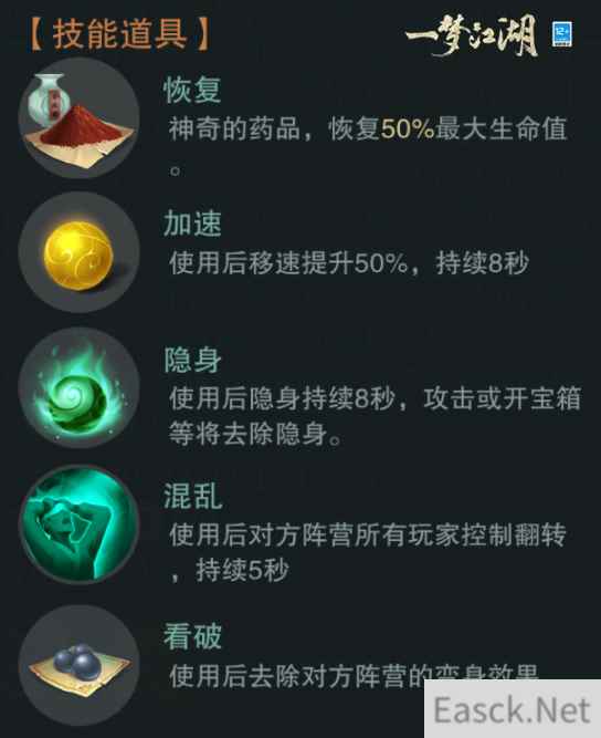 而在摸金校尉阵营的少侠则可拥有优秀的跳跃能力以及附带击晕效果的回旋攻击。摸金校尉可以借助优秀的跳跃能力跨越墓穴中的障碍物,而回旋攻击扔出的回旋镖则可以将敌人击晕2秒,搭配得当即可在危机时刻化险为夷。 【道具介绍】 在“荒冢危局”玩法中,红衣魅影与摸金校尉除了各自拥有独特的技能以外,双方还均可以使用在墓穴中时不时会刷出的随机道具。道具又分为技能道具及变身道具两种。每个道具所产生的效果各不相同,少侠们可以根据根据道具特性进行合理使用。 技能道具有恢复、加速、隐身、混乱和看破五种,有的能回复生命值,有的能提升移动速度的,还有的能使对方阵营陷入混乱。