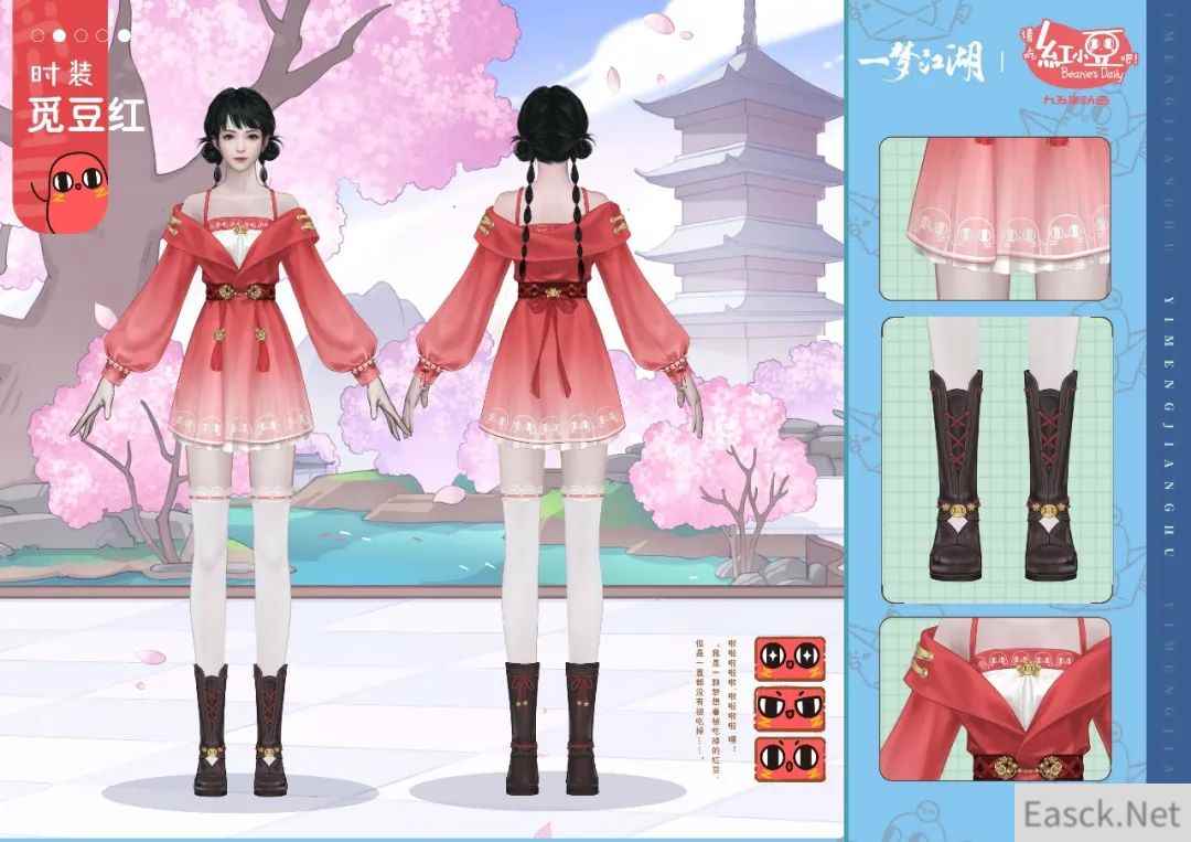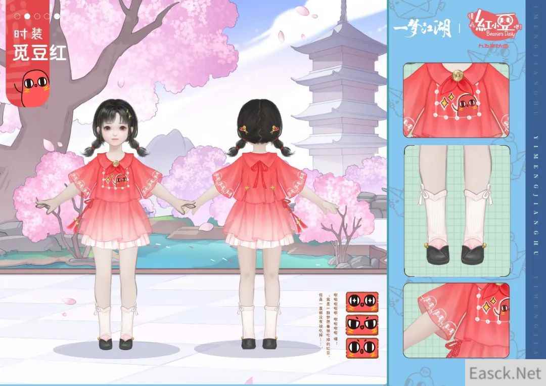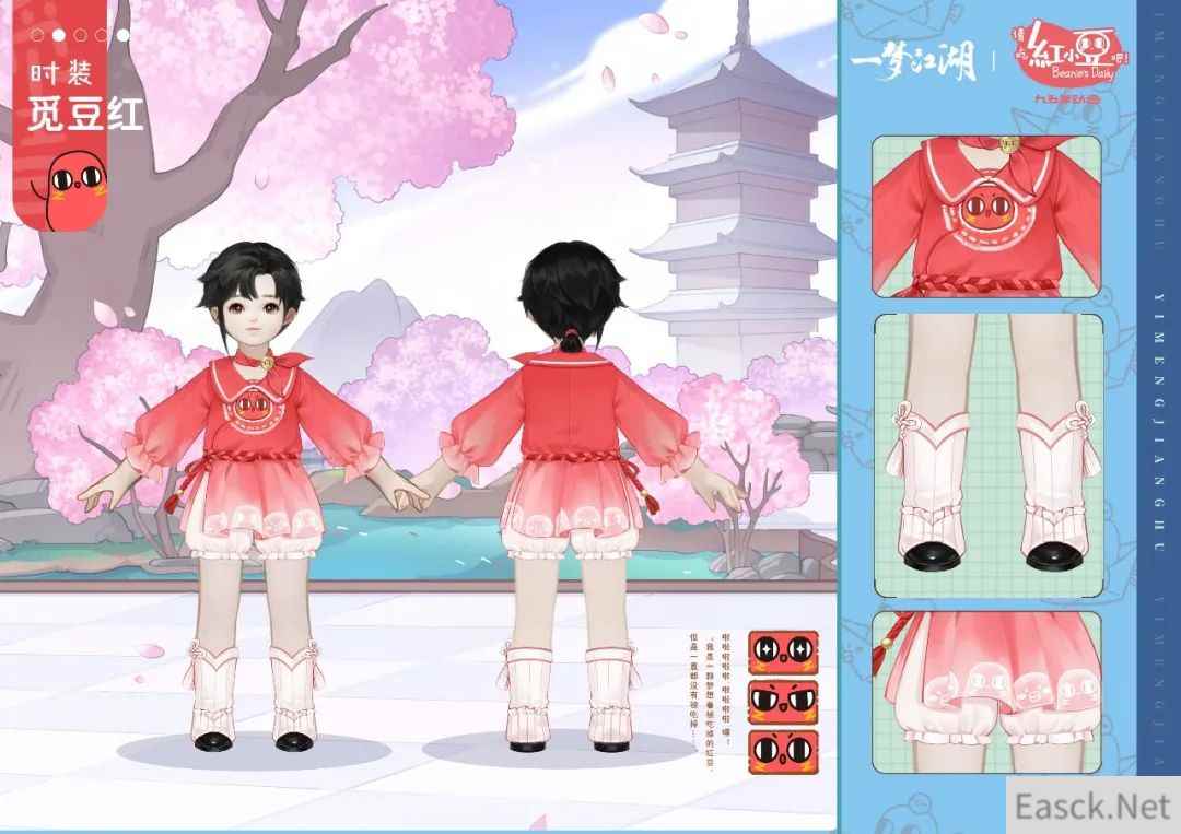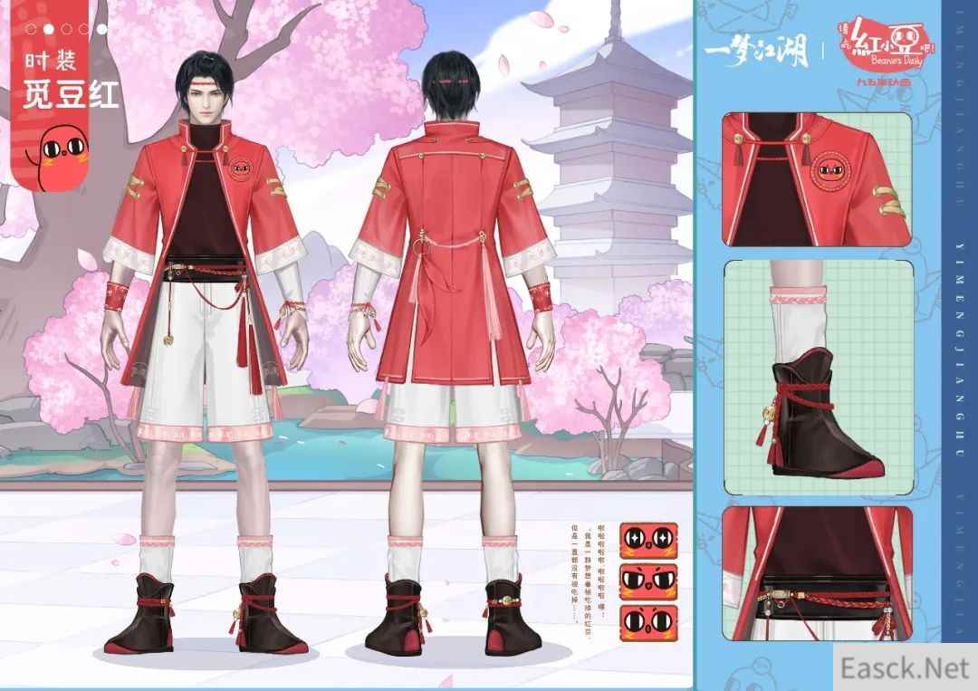 《一梦江湖》X《请吃红小豆吧!》联动即将开启,联动时装元气满满 此次《一梦江湖》X《请吃红小豆吧!》联动来袭,联动时装·觅豆红即将和少侠们见面,治愈少侠们继续前行的道路。红小豆联动时装·觅豆红取色自红小豆经典配色,点缀红豆元素配饰,召唤每一个喜欢红小豆的你。 少侠头戴编绳抹额,利落的短发被潇洒别起,立领设计神气十足,剪裁舒适又挺括有型,少年感十足。