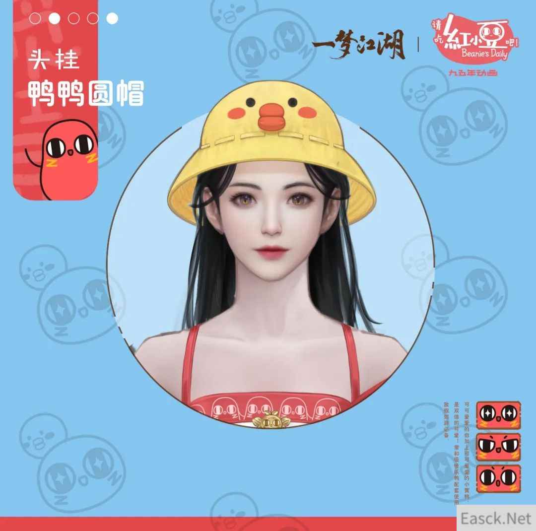 红小豆同款激萌头挂·鸭鸭圆帽是一顶明黄色的圆顶小帽,手感柔软,戴起来舒适极了。帽檐自然下垂,营造出一方荫凉。少侠们赶快戴上这顶可爱的帽子,一起大闹江湖吧。