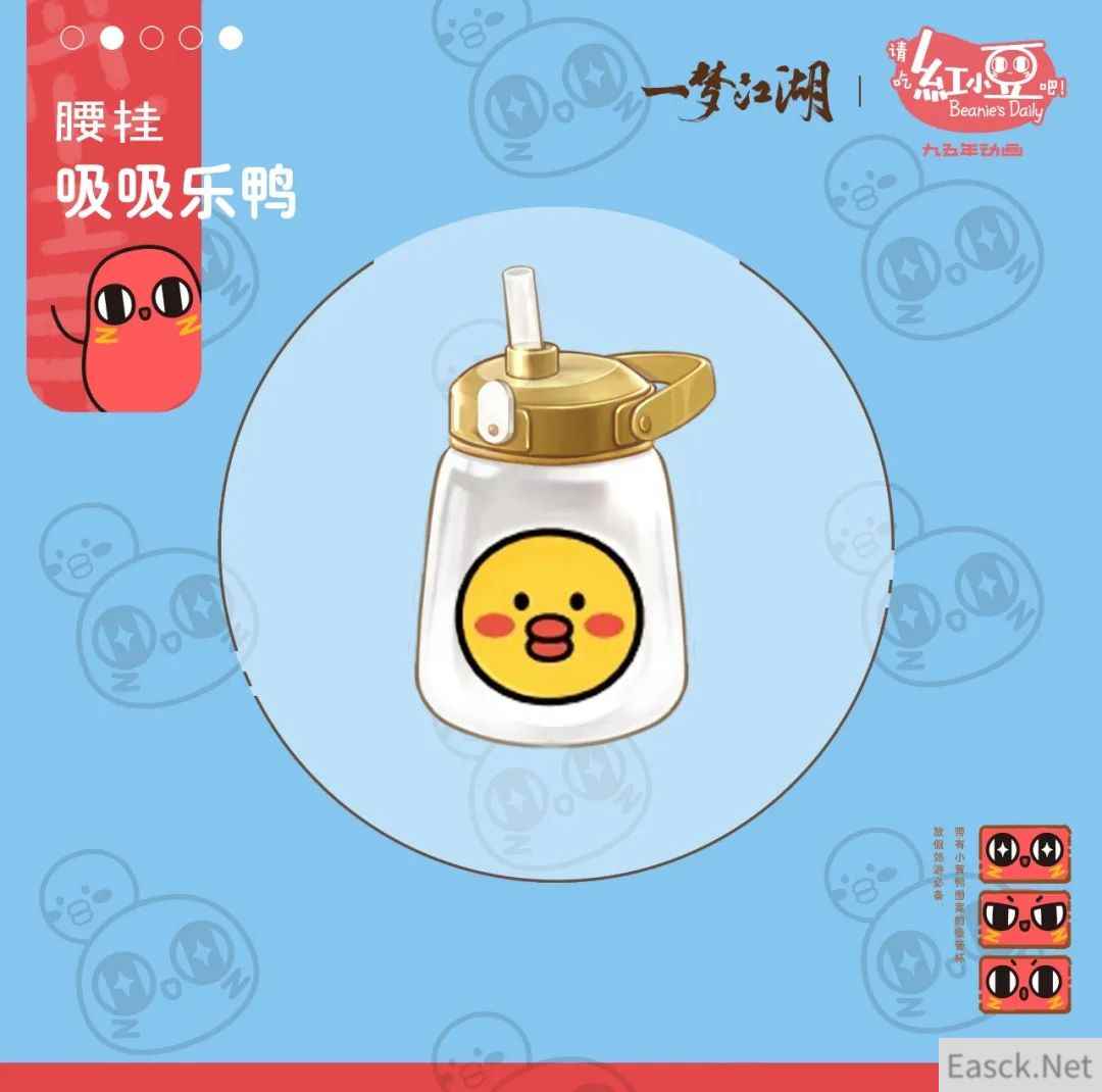红小豆同款激萌挂件来袭,感受双倍可爱暴击 《一梦江湖》X《请吃红小豆吧!》联动还为少侠们带来了红小豆同款激萌挂件,萌力十足,治愈少侠们继续前行的道路。 腰挂·吸吸乐鸭是一个印有Q萌小黄鸭雷帝图案的小巧水杯,可以成为少侠们的喝水提示小助手,希望每一位少侠多喝热水,才能和建国老师一样保持靓丽容颜哦~