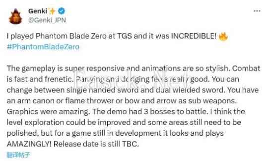 东京电玩展(TGS 2024)正式举行,国产单机动作游戏《影之刃零》也在TGS现场提供了试玩活动。游戏博主@Genki_JPN 在体验过本作之后,盛赞游戏画面优秀、战斗华丽刺激,感觉相当棒。