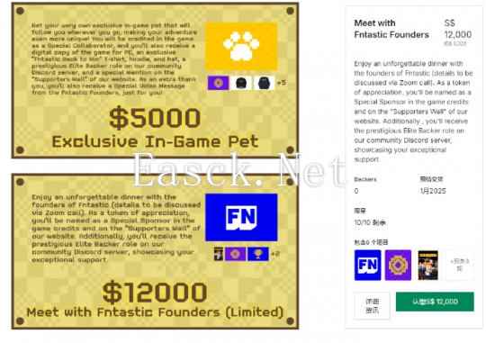 如果有人能一次缴纳500美元的金额,将会获得专属宠物,并被标记为特殊合作者,Fntastic工作室的创始人将发布专属感谢视频。 如果有人能一次缴纳12000美元的金额,就能获得跟游戏主创共进晚餐的机会。同时其本人的形象,也将被制作到游戏当中。(类似《鹅鸭杀》、《糖豆人》中的角色皮肤)