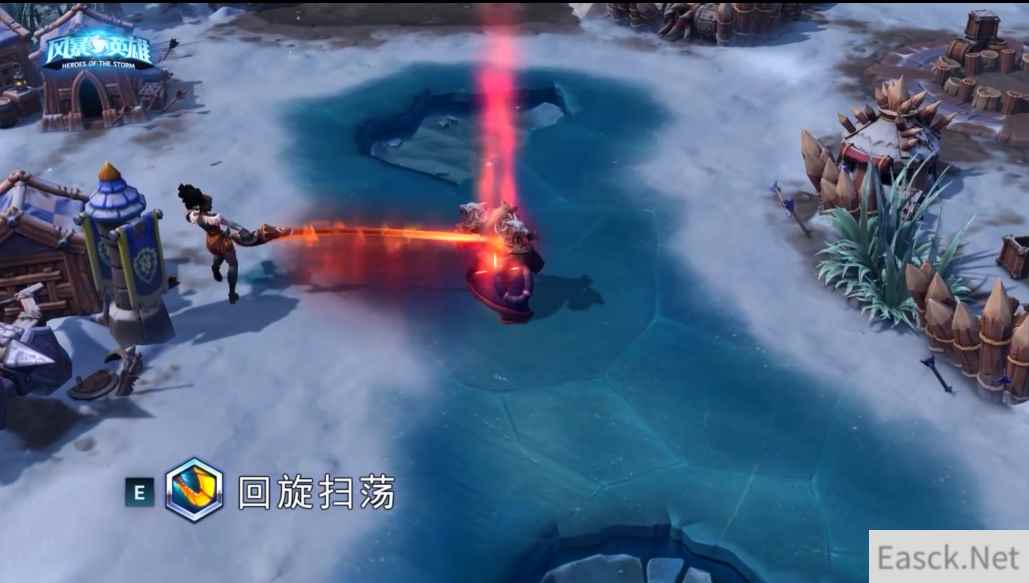 E技能:回旋扫荡: 琪拉用剑缠住第一个命中的敌人英雄,并使其昏迷。缠住敌人后,琪拉快速围绕目标回旋,对自己和目标之间的敌人造成伤害。重新激活会使琪拉飞向目标,将其击退,造成伤害并使其昏迷。