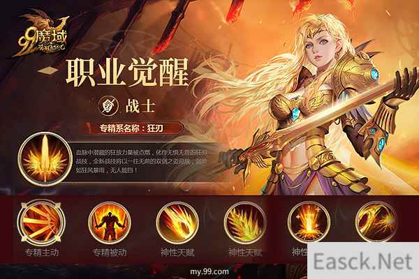 战士觉醒:痛快连招 无人可挡 无惧无畏的战士用一套“飞天连斩”锁定了《魔域》最经典职业的地位,而此次觉醒后的战士将手持双刃,以出色的连斩手段令对手闻风丧胆! 战士专精以“狂刃”为名。每当释放连招技能后战士便会进入“破空”状态,可施展全新主动技能“破空旋斩”跃向对手造成伤害;而当战士释放“旋风利刃”技能则开启“旋舞”状态,获得释放“旋舞战刃”的能力,投掷战意之刃对敌造成持续伤害,两种状态无法共存。而被动技能“千仞战心”可在任意技能命中敌人后为战士添加“精准”印记,提升破空旋斩或旋舞战刃伤害效果,无论爆发还是拉锯都将更为得心应手。