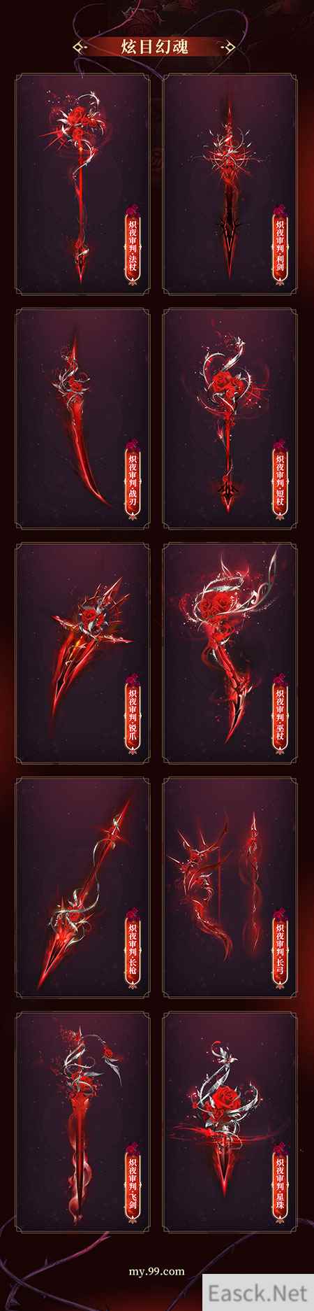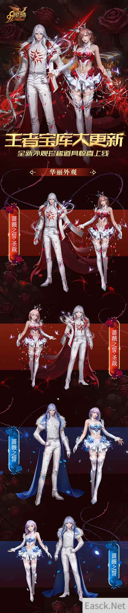 华美“蔷薇”惊艳盛开 王者宝库全新外观重磅解封 春天是鲜花绽放的时节,而此次王者宝库的外观更新,也以一朵蔷薇的盛开为主题。蔷薇之誓·圣裁系列外观采用热烈的红白色调搭配,看似简约却处处上心细节设计。男装的胸前烙印着盛开的红蔷薇,一席风衣格外的英姿飒爽,女装则采用了白色百褶短裙搭配红色抹胸设计,时尚中带有一股暗涌的热情,仿佛在夜里炽热盛开一般。而蔷薇之誓系列外观更突显神秘清冷,冷色调的白紫搭配如空空幽谷,让人浮想联翩。 两个为玩家带来完全不同感受的全新蔷薇主题外观要如何获得呢?勇士们只需要前往王者宝库解封宝箱,就有机会获得内含“蔷薇之誓外套包”的“蔷薇之誓大礼包”。而拥有3份“蔷薇之誓大礼包”,即可前往卡诺萨城王者军团特派员·加尔巴处兑换“蔷薇圣裁大礼包”或“灼焰幻花”光效。想要获得“蔷薇之誓·圣裁”外套的勇士们,也可集齐3件“蔷薇之誓”外套进行兑换。《魔域》版“冰与火之歌”,就等你来选择。 除此之外,全新炽夜审判系列幻魂同步上线,同样的红蔷薇主题让各大武器装备着上了冷酷血色,在黑夜中暗暗发光,更显别样炫目。