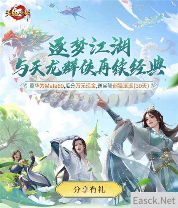 逐梦江湖与天龙群侠再续经典,为了感谢大家的一路相伴我们还为大家超豪华活动,分享集卡就能领取丰厚物资,其中有华为Mate60手机、坐骑熊猫滚滚(30天)、乔峰鹅等豪礼等你来暴击!快来参与活动吧:https://tlbb.qq.com/cp/a20240409kite/index.html