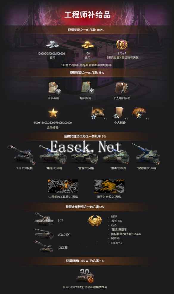 最重要的是,完成最后的阶段20后,您将有机会驾驶传奇租用坦克E-100 WT参加5场标准模式战斗! 【开启工程师补给品】 完成活动任务和特定进度阶段,以及击败稀有的E-220 BT后,您将会获得猎犬补给品和工程师补给品。工程师补给品有机会掉落来自5个类别的游戏内物品,包括全新金币坦克,如E-77、LKpz.70(K)和ION工程。除了通过完成特定的进度阶段来获取工程师补给品,还可以通过在特惠商城中购买特殊礼包来获取。