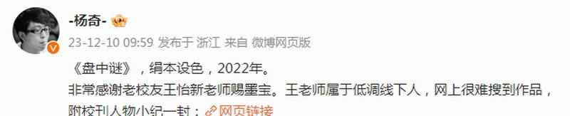 对此美术总监杨奇在微博上晒出了这幅壁画的原画,以及作者的信息。据悉原画名字为《盘中谜》,作于2022年;作者是来自中国美术学院中国画系人物专业研究生王怡新,是杨奇的校友。