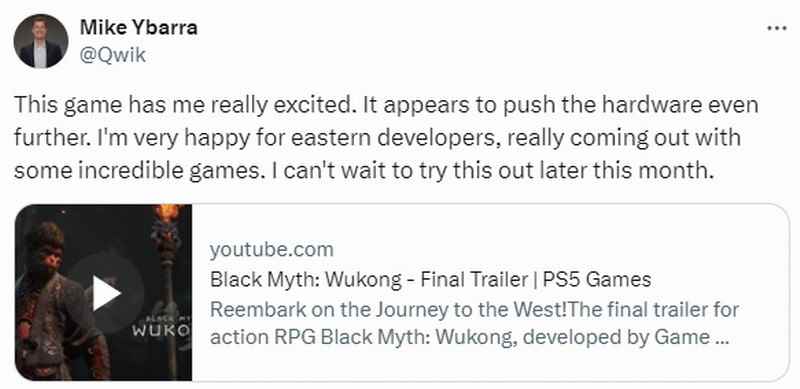 前暴雪总裁Mike Ybarra也在推特上发文,称非常期待《黑神话:悟空》,并认为该作推动了硬件的发展。