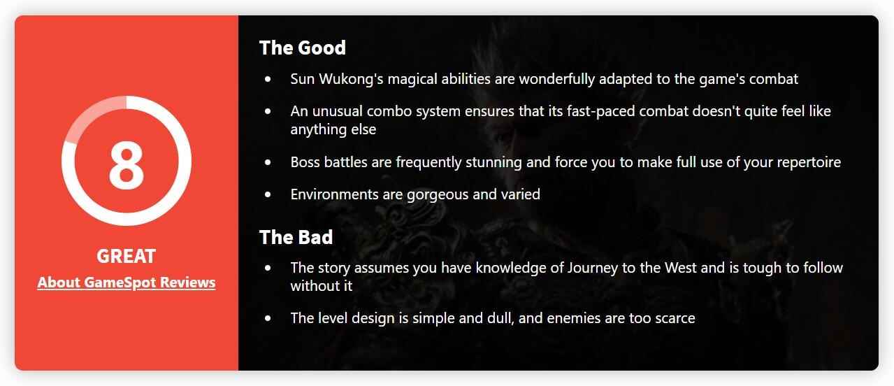 《黑神话:悟空》媒体评分现已解禁,其中现在评价汇总网站metacritic(54家评分)均分82,IGN为该作打出了8分的评价,而另一家知名媒体Gamespot也给出了8分。让我们来看一下。