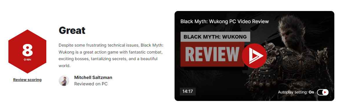 《黑神话:悟空》外媒口碑解禁,IGN 8分。