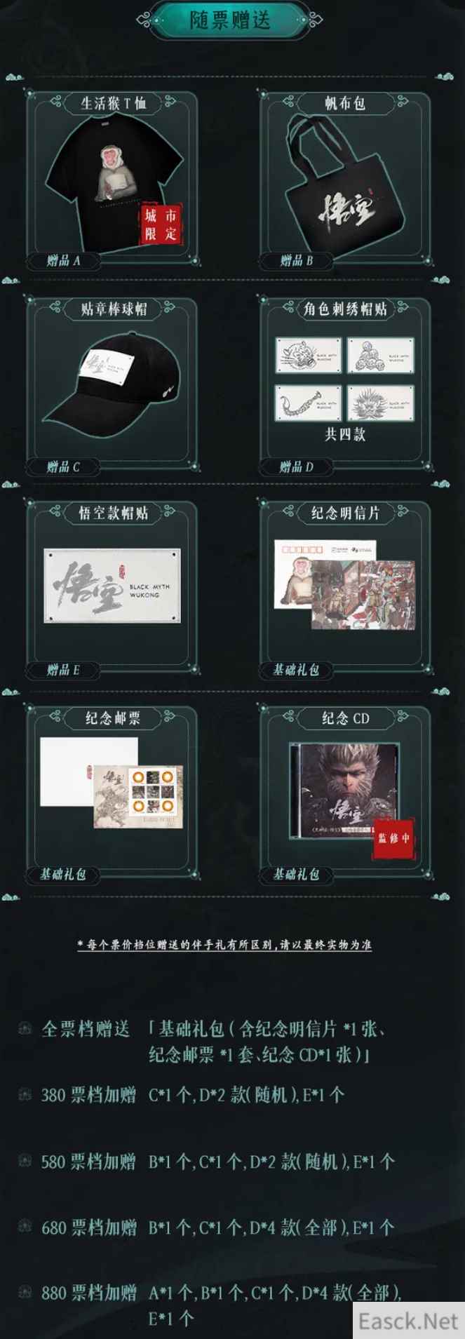 随票附赠《黑神话:悟空》音乐会伴手礼,内含城市限定周边,每个票价档位赠送伴手礼有所区别。