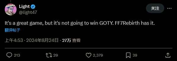 在社交媒体上也有很多英文圈的玩家不认为它能拿年度游戏,纷纷给出了自己的年度游戏选择,其中最多的是《最终幻想7:重生》——但是根据以往惯例重制版几乎是肯定拿不了这个奖的。
