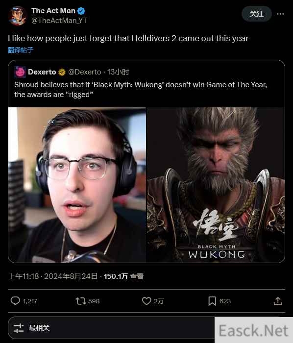 也不是所有人都认同他们的观点,油管游戏新闻与讨论类视频 UP 主 TheActMan 就表示,很多人似乎忘了《绝地潜兵2》是今年推出的——然而它即便开局确实似乎有点机会,这款游戏后续频繁暴雷,已经完全没有机会了,更不要说体量上跟《黑神话》还是差太多了。
