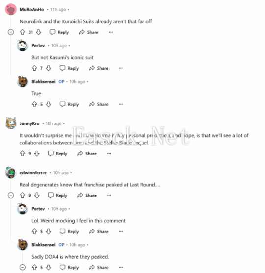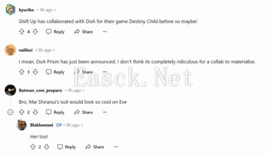 近日,Reddit用户Blakksensei在论坛发文,提出了一个颇具创意的想法:“虽然不太可能,但我觉得《死或生》和《剑星》的联动会很酷。”他补充道:“Eve穿上《死或生》中的所有服装一定很惊艳。”这一话题迅速引发了网友们的讨论,大家纷纷在评论区分享对这一联动的看法和猜测。 有网友指出,《剑星》中的“Neurolink”服装和《死或生》系列中的“女忍者服装”在风格上已经颇为相近。另一位网友则补充:“不过,还是不能少了霞那标志性的战斗服。”这种讨论引发了更多玩家对潜在联动的期待,一些人表示,他们非常欢迎《剑星》与《死或生》的合作。 一位玩家预测:“我个人的预感是,从现在到《剑星》续作发布之前,我们会看到很多跨界合作。” 有网友提出,《剑星》的开发商Shift Up曾与《死或生》合作过他们的另一款游戏《Destiny Child》,因此双方再度合作并非完全不可能。一些粉丝还提到了刚刚宣布的《死或生 Prism》游戏,认为这或许为未来的跨界联动铺平了道路。 |