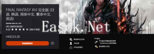SQUARE ENIX大作《最终幻想16》的完全版现已正式登陆PS5平台,港服售价为533港币(约合人民币480元),商店评分为4.52分,《最终幻想16》的标准版现售价为398港币(约合人民币359元)。