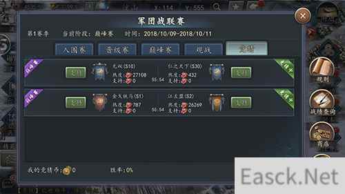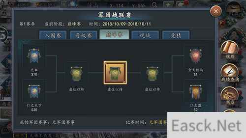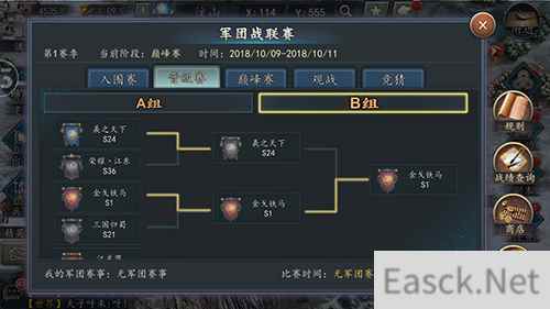 晋级赛阶段,16支军团按排名分成A、B组两组,组内两两配对混战,经过两轮的PK最终决出4强!截止写稿时,四强正向最终的巅峰冠军做着最后的排演与准备,有兴趣的同学可登陆游戏(官方微信公众号:sgz2017下载游戏)随时进行观战,还可以为喜欢的军团献花、竞猜,决战一触即发!