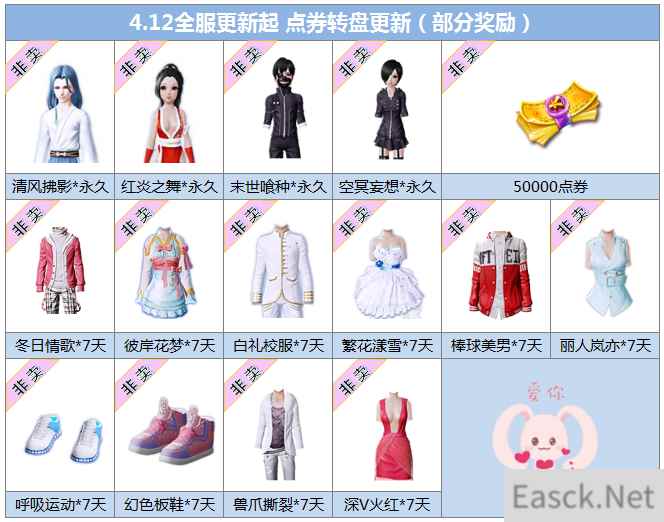 4月版本点券大转盘 活动时间:4月12日-5月版本前 活动地址:游戏内点券大转盘 一、活动奖励 全新永久动漫套清风拂影/红炎之舞上架!末世喰种/空冥妄想炫酷动漫套再度来袭!!此外还有各种热门非卖都在点券转盘等着你!