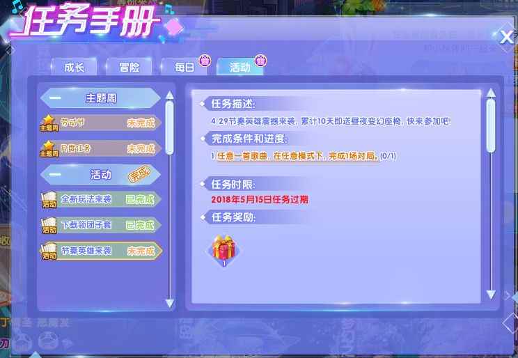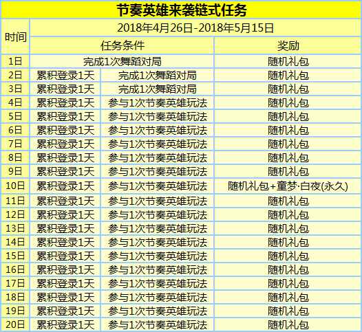 节奏英雄来袭链式任务 活动时间:4月26日-5月15日 活动地址:游戏内链式任务 一、链式任务 记得每天晚上完成任务后,到“任务系统—活动”领取奖励哦!心动不如行动,快上线和春神一起体验“节奏英雄”玩法吧!