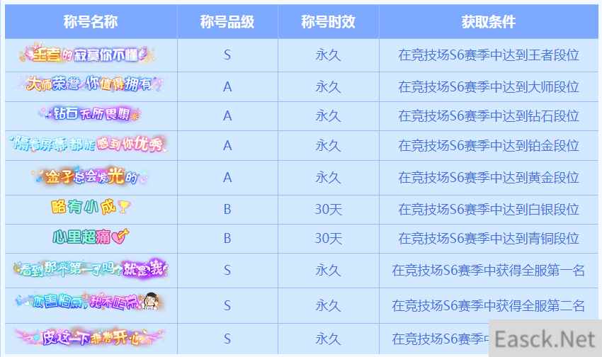 四、S6赛季全新段位称号 S6赛季更新段位称号,黄金及黄金以上的段位称号是永久的哦!这么有趣的称号你真的不考虑pick一下吗?头上顶着这样的称号,我隔着屏幕都能感觉到你很优秀啊!