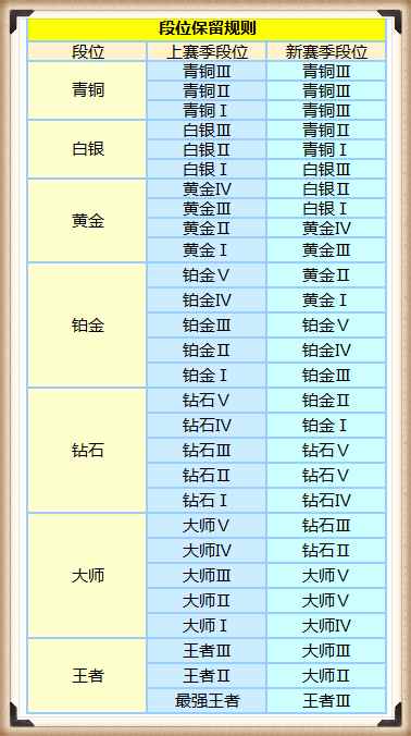 二、段位规则 在S6赛季中,段位继承规则跟往季相同,将会在S5赛季的基础上按照规则进行继承。例如,在S5赛季黄金Ⅲ的玩家将会在S6赛季中继承白银Ⅰ的段位,让玩家上分更轻松!